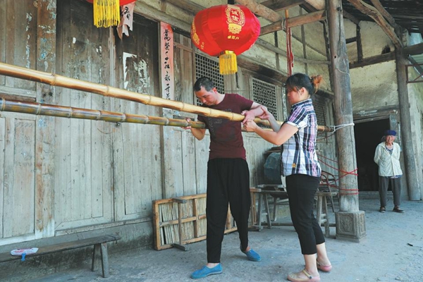 靳珍秀攙扶丈夫做身體恢復鍛煉。