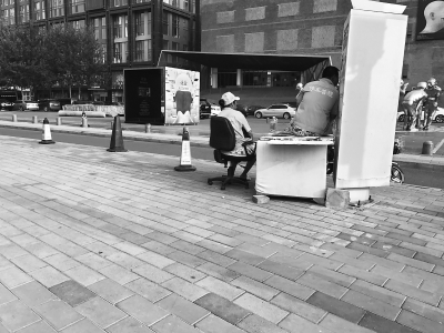 在黃木廠路北段與百子灣路的交叉路口處,路邊擺放著禁止停車的標志和“違章停車拍照處罰”的牌子。在距離路口幾十米外的今日美術館北側路邊,有一男一女躲在樹蔭下乘涼,男子身穿藍色制服,背后有“停車收費”字樣,女子身穿橙色上衣,背后同樣也印有“停車管理”字樣,在他們身邊擺著幾個黑色的錐桶。不遠處路邊有一塊禁止車輛臨時、長期停放的交通標志牌,下面有“百子灣路”幾個字,然而標志牌中央的紅色交叉線被抹去了,但痕跡仍在,牌子旁邊的人行道上擺著兩張椅子。這條路的北側同樣有一塊禁止停車的標志牌,路南側停滿了車,地面上劃有停車線。