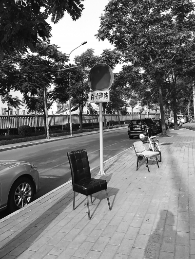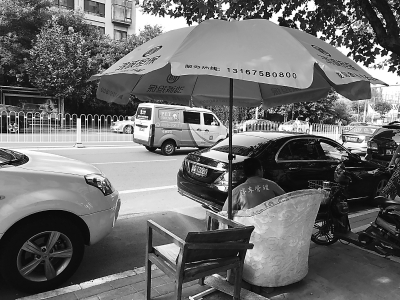 順著停車帶往東走,會看到身穿橙色制服的幾名男子騎著電動自行車來回巡視,每當有車從停車位開走,或者準備停車時,他們就會上前,從車的前擋風玻璃取下小紙條,按上面的時間收錢。在這條路中段的人行道上,立著一把黃色的大傘,傘下面擺著兩把椅子,一名身穿淺藍色上衣的男子正在路邊喝水,所穿的衣服后背上印著“停車管理”四個字。他告訴記者:“這條路兩側路邊停車都是要收費的,第一個小時6元,第二個小時9元!彼f因同村的老鄉有事,所以臨時來替他上幾天班。他指了指頭頂的遮陽傘說,這把傘和沙發都是路邊一家金融公司提供的。