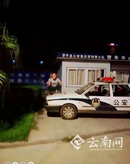 男子踩踏警車,拍照炫耀。云南網(wǎng) 圖