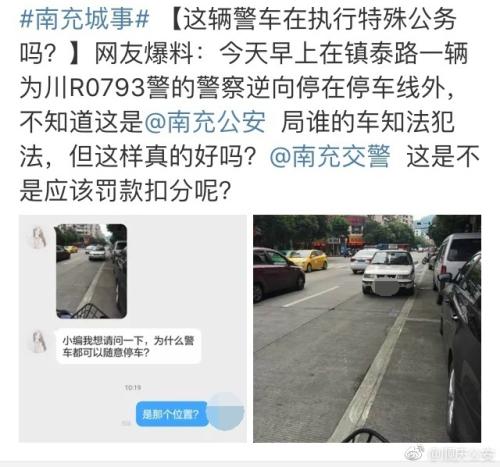 中新網8月13日電 據四川南充市公安局順慶區分局官方微博消息,2017年8月12日上午10時許,新浪微博用戶發帖稱“今天早上在鎮泰路一輛為川R****的警車逆向停在停車線外",質疑警車“亂停放",順慶區分局發現該情況后立即組織人員開展調查工作。