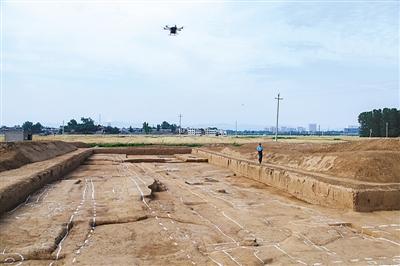 考古工作人員在二里頭遺址宮殿區發掘現場進行航拍。新華社發
