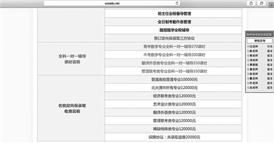 同時,北青報記者注意到,由于考生報考的學校、專業不同,考研培訓費用也略有差異,其中報名北大、清華等名校的考研“保過班”費用普遍較高。例如,在一家名為“新祥旭”的考研培訓機構,其“名校定向保錄班”中,針對普通高校普通專業培訓費用為10萬元,而針對北大、清華名校的考研培訓費用則高達12萬元。