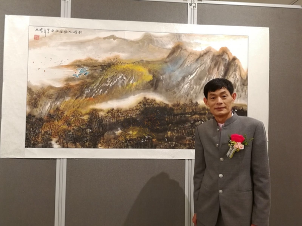 步入展廳,氣勢磅礴的多幅山水作品映入眼簾,如連綿不斷的山脈,猶如置身于大山大嶺之中。尤其擅長于山水畫創作的盛懷杰接受大公報記者采訪時說,本身是美術老師,后來因緣際會開始專研創作山水,偶也寫花鳥等主題,但認為山水最能表達人的情懷,以及對于祖國山河的熱愛、謳歌。山水畫還可表現各地不同地區不同季節的特色。
