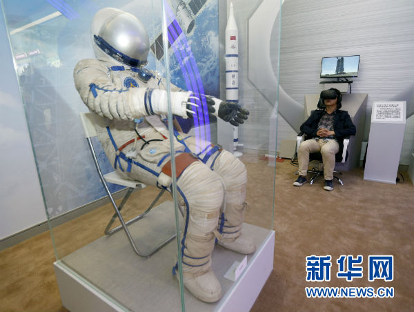 9月26日,參觀者在進行長征二號F運載火箭發射場組裝VR體驗。新華社記者沈伯韓攝