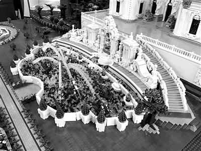 10月20日,“大水法”模型制作團隊的負責人王先生告訴北青報記者,他們是從今年開始籌備用積木復原圓明園這一項目的,耗時半年,目前已經完成觀水法、大水法、遠瀛觀部分的搭建,共使用了約66萬塊積木,模型沙盤所占面積為4.47平方米。