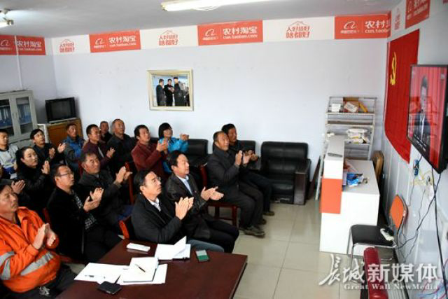 ↑駱駝灣村村民和長城新媒體集團記者給十九大報告熱烈鼓掌。記者 李剛 攝