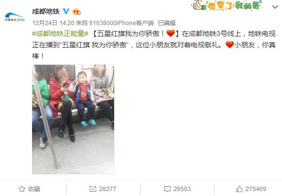 據微博@成都地鐵稱,在成都地鐵3號線上,地鐵電視正在播到“五星紅旗我為你驕傲”,這位小朋友就對著電視敬禮。