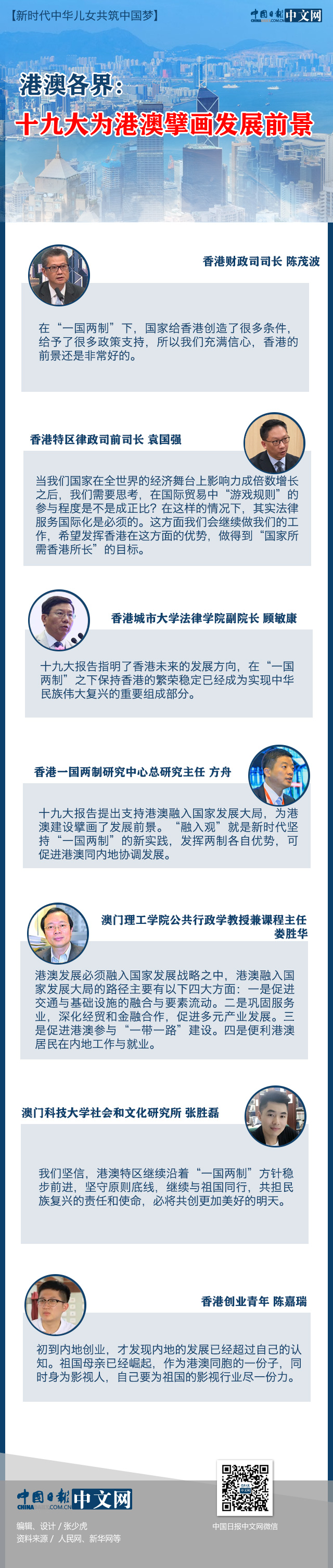 回歸祖國以來,港澳依托祖國、面向世界,“一國兩制”在港澳的實踐取得了舉世公認的成功。十九大報告明確指出,香港、澳門發展同內地發展緊密相連,支持香港、澳門融入國家發展大局。港澳各界表示,十九大為港澳建設擘畫發展前景。