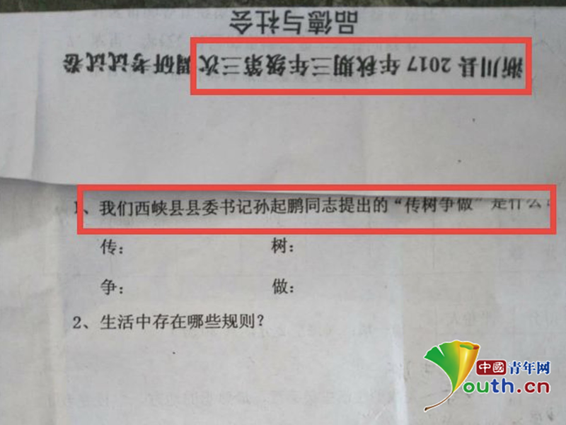 一名家長整理的試卷圖片顯示,淅川縣與西峽縣多份試卷試題大范圍雷同。一份小學三年級的《品德與社會》試卷中要求學生回答“我們西峽縣縣委書記孫起鵬同志提出的‘傳樹爭做’是什么?生活中存在哪些規則?”。除此以外,試卷中還有多道西峽特色顯著的題目。