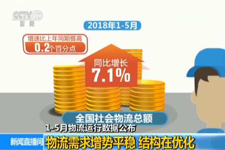 1-5月,全國社會物流總額為105.3萬億元,同比增長7.1%,增速比上年同期提高0.2個百分點。
