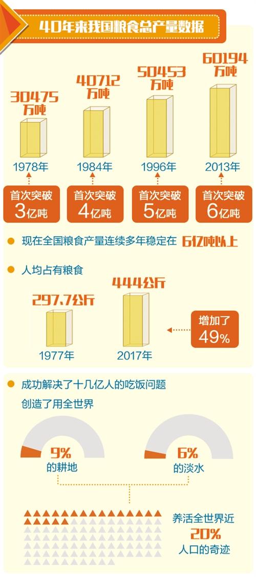 改革開放以來,由于實行了家庭聯產承包責任制以及一系列惠農政策,調動了農民生產積極性,扭轉了農業生產長期停滯的局面,糧食產量連年大幅增長。40年來,我國糧食總產量翻了一番,從1978年的3億噸提高至2013年的6億噸。現在全國糧食產量連續多年穩定在6億噸以上。人均占有糧食從1977年的297.7公斤上升到2017年的444公斤,增加了49%。