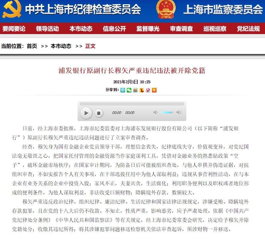 據(jù)上海市紀(jì)委監(jiān)委消息:日前,經(jīng)上海市委批準(zhǔn),上海市紀(jì)委監(jiān)委對(duì)上海浦東發(fā)展銀行股份有限公司(以下簡稱“浦發(fā)銀行”)原副行長穆矢嚴(yán)重違紀(jì)違法問題進(jìn)行了立案審查調(diào)查。