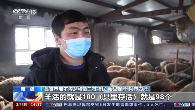 昌吉市廟爾溝鄉和諧二村牧民 毛里提汗·阿布力汗:外面天冷的時候,我們把羊娃抱過來(在圈里過夜)。我們這個羊活的就是100(只里存活)就是98個。
