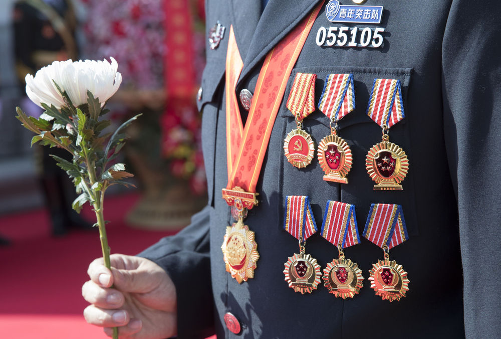 ↑2020年9月30日,在北京天安門廣場舉行的烈士紀念日向人民英雄敬獻花籃儀式上,一名公安干警手持白菊,寄托哀思。新華社記者 王曄 攝