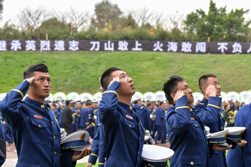 ↑2019年4月4日,參加四川木里森林火災撲救中英勇犧牲烈士悼念活動的森林消防官兵向犧牲的戰友敬禮。在這場火災中,共有27名森林消防隊員犧牲。新華社記者 張超群 攝