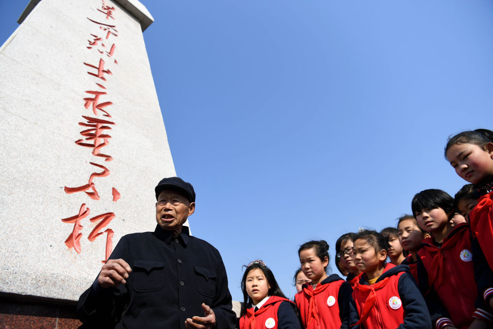 ↑今年89歲的胡兆倫是安徽省懷遠縣陳集鎮胡劉烈士陵園管理員,70多年如一日為英烈們守墓。這是他在烈士陵園為前來掃墓的小學生講解烈士的事跡(2019年3月14日攝)。新華社記者劉軍喜攝