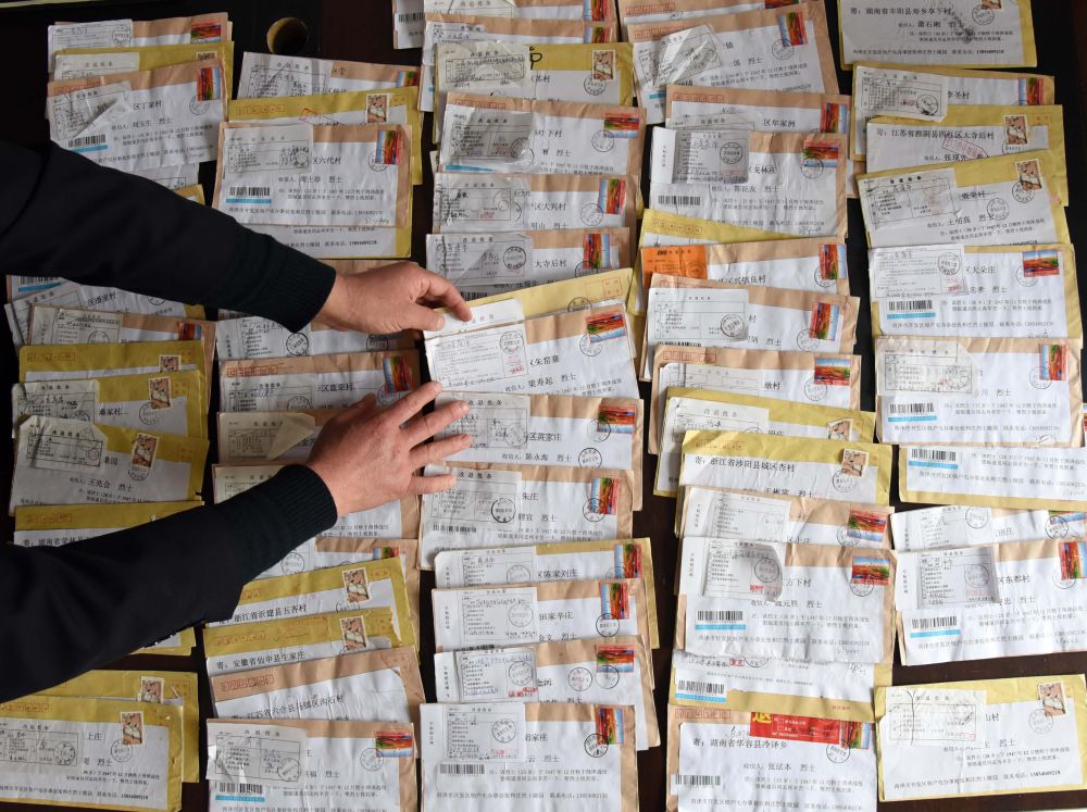 ↑2008年,時任山東省菏澤市張和莊村黨支部書記的張景憲決心為張和莊烈士陵園的無名烈士找到家鄉和親人,告慰他們的英靈。從2014年開始,張景憲按照先前尋訪到的資料地址,通過寄信等方式至今已為38位烈士找到親人。這是2019年3月20日,張景憲在整理多年來他收到的退信。新華社記者 王凱 攝