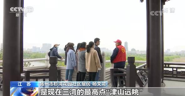 江蘇揚州杉灣花園社區居民 楊文龍:我們處的這個位置是現在三灣的最高點“津山遠眺”,像現在這個春天,我們大家看到可以說是繁花似錦,古運河的水是非常清澈......