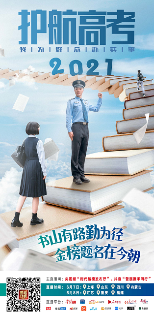 中國警察網北京6月4日電 記者邵磊報道:2021年全國高考即將拉開帷幕,6月7日、8日,公安部新聞宣傳局將聯合中央廣播電視總臺綜合頻道“時代楷模發布廳”,開展公安機關“我為群眾辦實事·護航高考2021”兩場“云”直播活動,多地公安機關接力直播,每天早7時30分開始,每場時長約1.5小時。