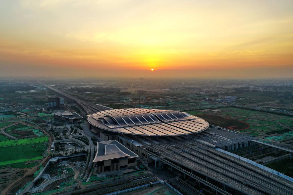 7月1日在河北雄安新區京雄城際鐵路雄安站拍攝的日出(無人機照片)。新華社記者 牟宇 攝