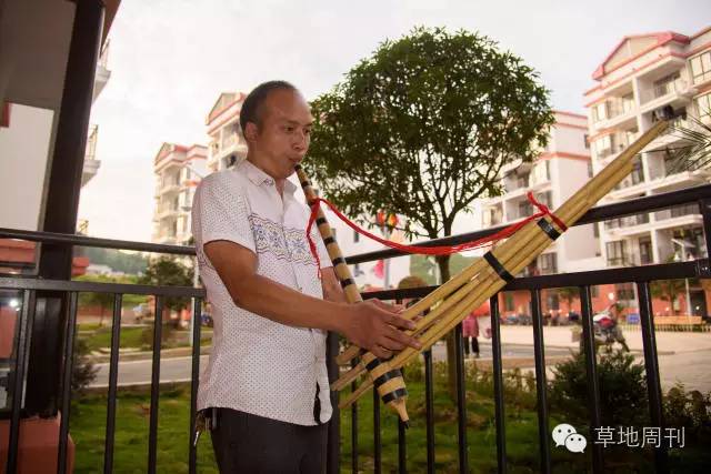 貴州省惠水縣明田安置小區,梁王地正吹奏蘆笙。(9月12日攝)新華社記者 劉續 攝