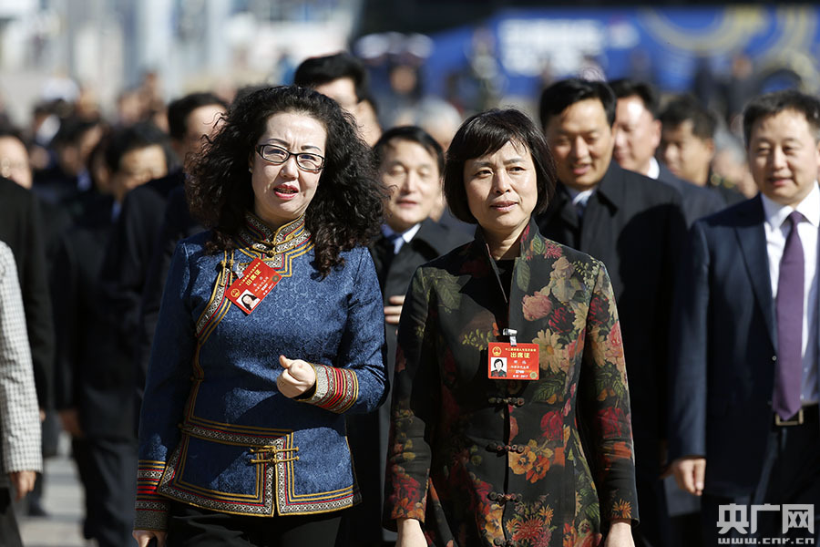 3月8日,十二屆全國人大五次會議在北京人民大會堂舉行第二次全體會議。圖為少數民族代表抵達天安門廣場步入人民大會堂。央廣網記者 石昊鑫攝