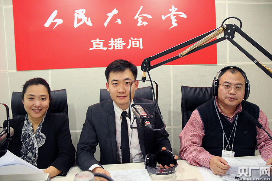 3月8日15時,第十二屆全國人民代表大會第五次會議在人民大會堂舉行第二次全體會議,中央人民廣播電臺對本次大會進行現場直播。圖為主持人龐瑩(左)、主持人鶴佳(中)、評論員白中華(右)。央廣網記者 吳海波攝
