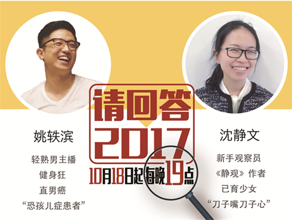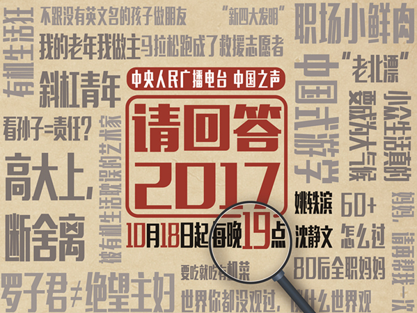 10月18日19:00—20:30,中國(guó)之聲十九大特別節(jié)目《請(qǐng)回答2017》推出第一期《不一樣的煙火:來一場(chǎng)和90后別開生面的對(duì)話》。90后互聯(lián)網(wǎng)創(chuàng)業(yè)者、“摩羯座工作狂”Debbie;90后創(chuàng)業(yè)青年、“執(zhí)念管理者”霄鵬;90后類公務(wù)員、“在體制內(nèi)創(chuàng)業(yè)”力力;90后斜杠青年、話劇團(tuán)指導(dǎo)老師琳琳;帶領(lǐng)一大幫90后共事、60、70跨界資深職場(chǎng)人代表鄧?yán)賹⒆隹椭辈ラg!