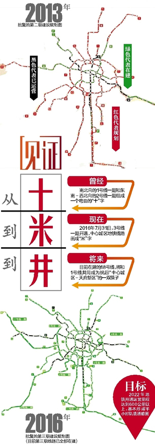 2016年7月31日,3號線一期開通,中心城區地鐵線路畫成“米”字