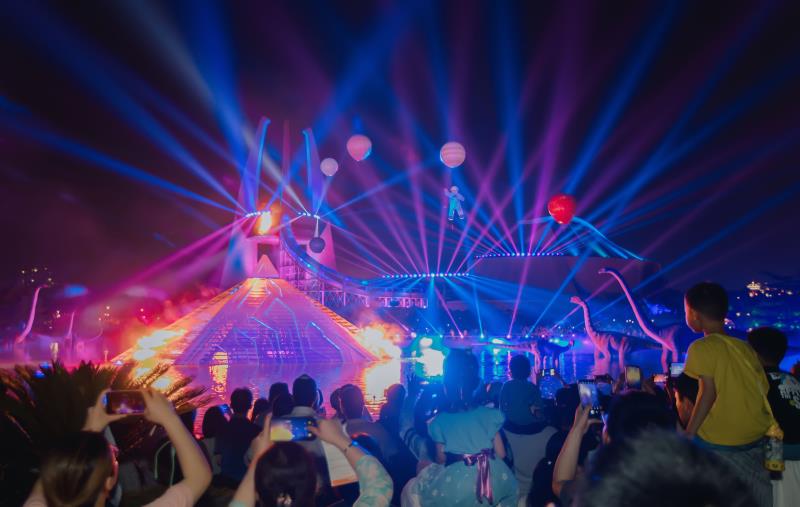 為打造全方位的沉浸式效果,《D秀》團隊歷時一年多的技術研發,以數字多媒體聲光演藝為主要手段,以中華恐龍館為核心,對周圍的空間格局、觀演環境等進行了全方位的考量。在精心挑選的位置上新增了數百個全新的燈光效果裝置,力求從觀眾入場開始,就能夠根據故事節奏設置,營造不同的現場氛圍,并能夠配合劇情發展,帶來進一步升級的觀賞感受。其中,為《D秀》特別定制的水中升降三維立體數字光影裝置也震撼亮相,成為了此次大秀的點睛之筆。