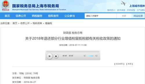 東方網記者夏陽8月21日報道:今年6月底,財政部和國家稅務總局聯合印發了《關于2018年退還部分行業增值稅留抵稅額有關稅收政策的通知》(財稅〔2018〕70號),明確對屬于裝備制造等先進制造業、研發等現代服務業的18個大類行業和電網企業退還增值稅期末留抵稅額。