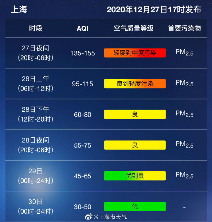 今夜明晨,上海空氣質量欠佳,為輕度到中度污染量級。明天早晨前后大部地區有霧,上午以前有輕度霾。