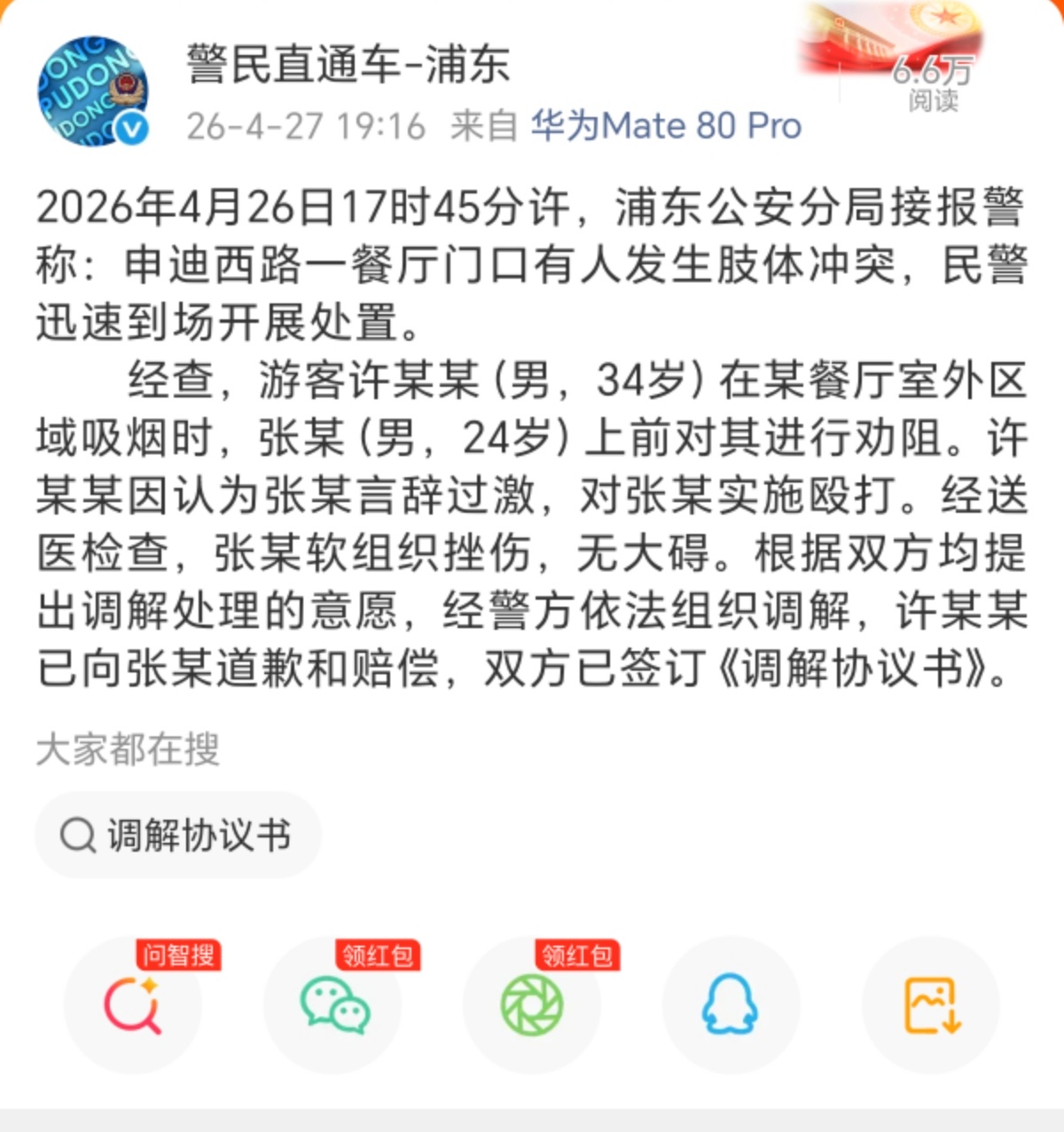4月27日晚間,上海浦東警方發布通報:“2026年4月26日17時45分許,浦東公安分局接報警稱:申迪西路一餐廳門口有人發生肢體沖突,民警迅速到場開展處置。”警方表示,打人者已向勸阻者道歉并給予賠償,“經查,游客許某某(男,34歲)在某餐廳室外區域吸煙時,張某(男,24歲)上前對其進行勸阻。許某某因認為張某言辭過激,對張某實施毆打。經送醫檢查,張某軟組織挫傷,無大礙。根據雙方均提出調解處理的意愿,經警方依法組織調解,許某某已向張某道歉和賠償,雙方已簽訂《調解協議書》。”