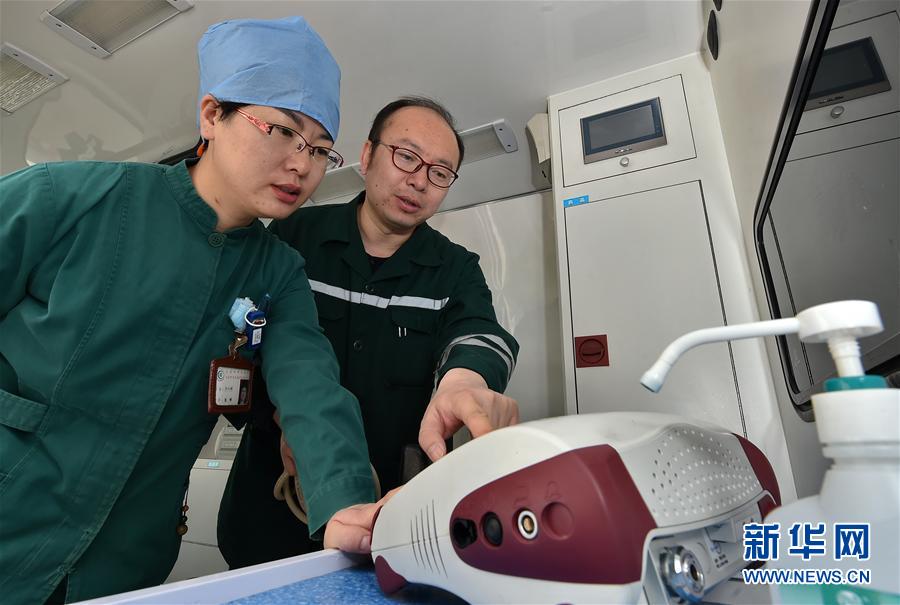 5月11日,許鵬飛為張娣介紹急救車上新進的呼吸機的使用方法。 許鵬飛坐著急救車與時間“賽跑”,老婆張娣在手術室里搶救患者……結婚11年來,這對護士夫妻攜手奮斗在救護一線! -