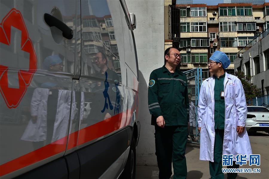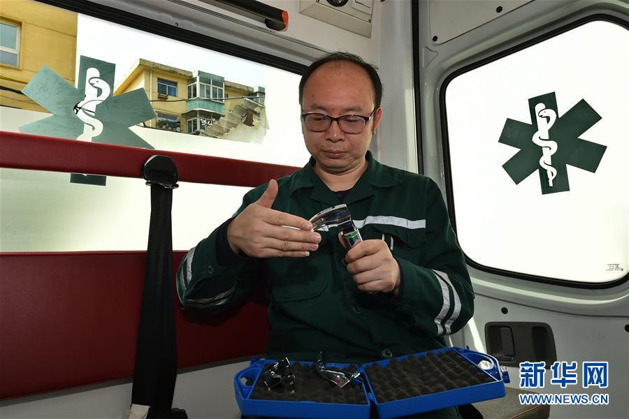 5月11日,許鵬飛在檢查太原市120急救中心急救車上的設備。 24小時候命的急救工作讓夫妻二人很少有時間顧家,家人的理解和支持讓他們倍感欣慰,同甘共苦的陪伴和救死扶傷的信念是他們堅守在護理崗位的最大動力! -