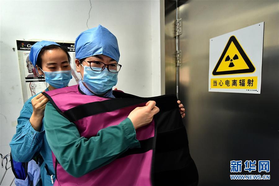 5月11日,山西省太原市中心醫院心內科導管室護士張娣(前)在同事的幫助下穿著鉛衣。 -