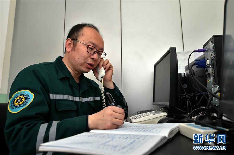 5月11日,許鵬飛在太原市120急救中心接聽急救電話。 -