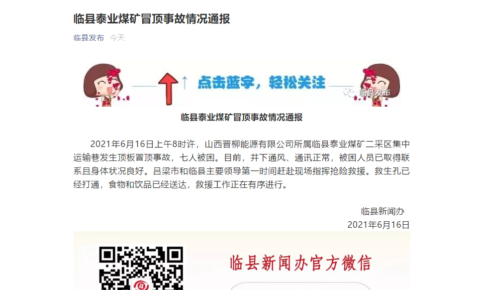 2021年6月16日上午8時許,山西晉柳能源有限公司所屬臨縣泰業煤礦二采區集中運輸巷發生頂板冒頂事故,七人被困。