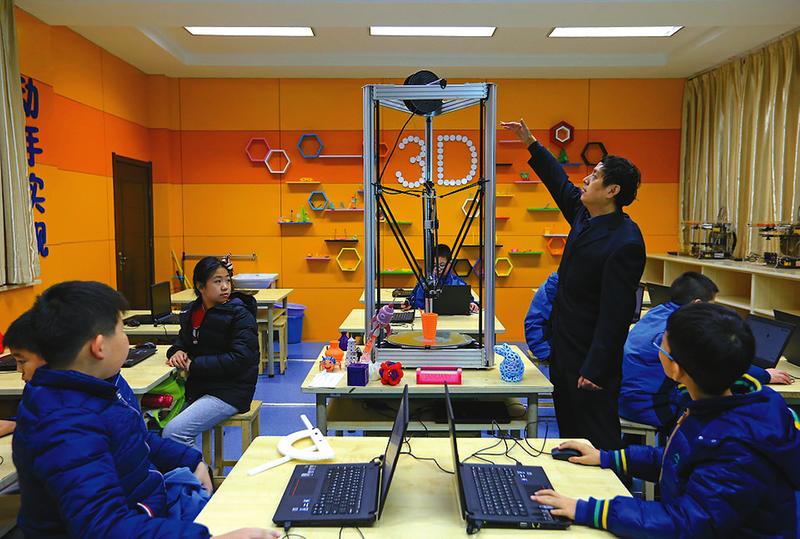 1月6日,西安交通大學附屬小學3D打印課上,趙文安老師正在為學生講解三角洲3D打印機運行原理。3D打印進入小學課堂,讓學生在課堂上高效完成創意構思、三維建模設計和成品打印的過程。