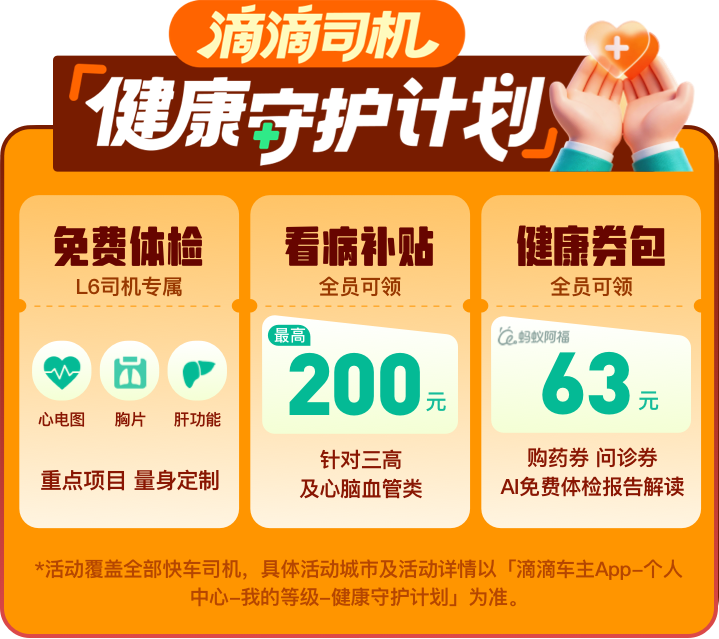 滴滴始終關注司機師傅的健康,于4月升級了“滴滴司機健康守護計劃”,為全國快車司機提供針對三高及心腦血管問題的季度健康補貼。同時,滴滴聯合互聯網健康平臺,首批與螞蟻阿福合作,為司機提供在線問診和線上購藥優惠。部分城市的L6 高等級司機還可享年度免費定制體檢。