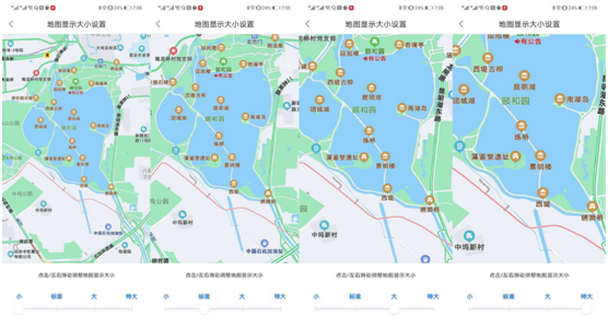 智能手機字號過小,無法便捷讀取準確的導航信息,是老年用戶出行時的一大難題。百度地圖通過地圖顯示大小調節功能,讓用戶可以按需設置字體及元素大小,使地圖信息更清晰易懂,為銀發用戶提供更舒適、方便的讀圖體驗。該功能的操作也十分簡便,用戶在百度地圖首頁的圖層界面中找到地圖顯示一欄,即可進行調整;還可通過百度地圖個人中心的通用設置,進行地圖顯示小、標準、大、特大四個檔位的選擇,讓出行信息一目了然。該功能已經在安卓系統上線,iOS系統也將在近期上線。