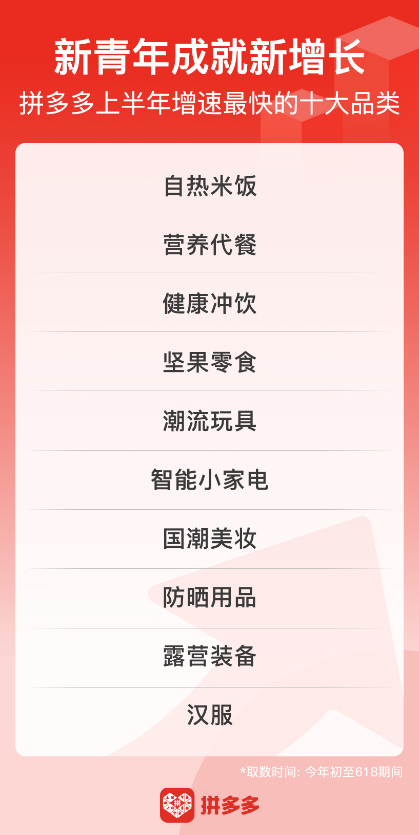 ▲ 拼多多發布今年初至618期間增長最快的十大消費品類,上半年拼單量增幅位列前三的快消品類均與“吃”相關。