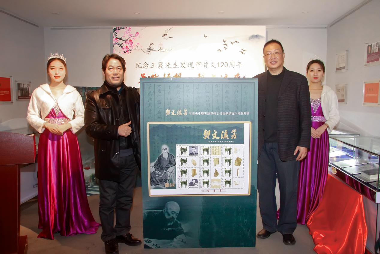 活動現場由天津近代歷史文化博物館出資,由中國郵政天津公司出品的“契文流芳紀念王襄先生發現甲骨文120周年”為主題的郵折和首日封進行了現場揭牌與簽字首發,F場還有近50余件甲骨文實物和百余幅甲骨文書法作品進行展覽。