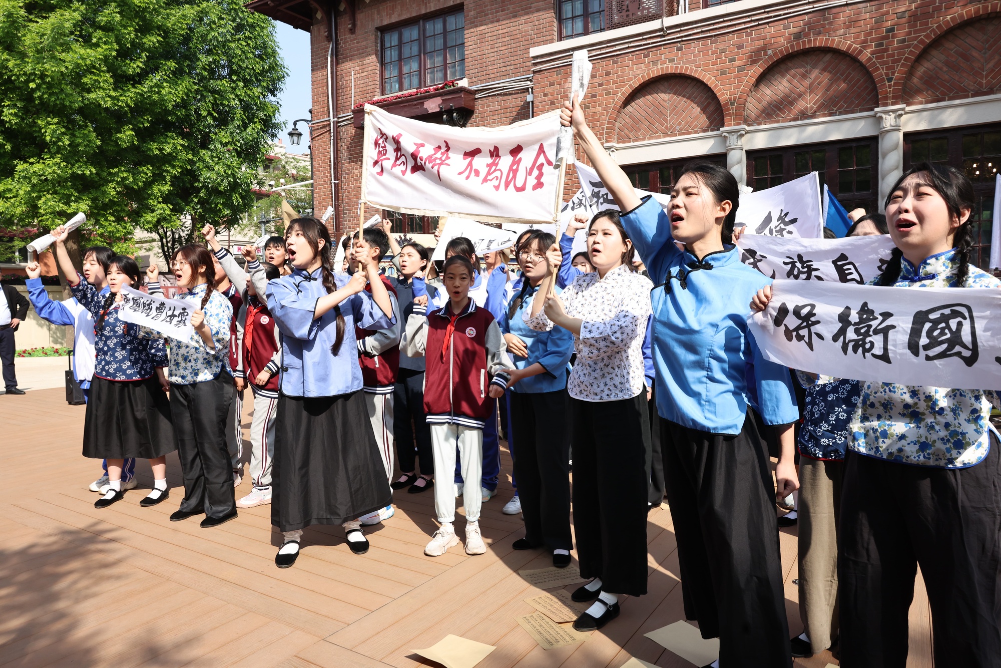 央廣網天津4月28日消息(記者周思楊)“中國人的脊梁,從來都不會折斷”“誓死力爭、還我青島”……4月26日,顧維鈞舊居前響起青年學生嘹亮的吶喊聲。來自天津外國語大學、新華中學、新華南路小學的近百名同學們,正在思政課教師的帶領下,參與“再現‘歷史’,聆聽愛國回響”——主題沉浸式“大思政課”,并引來廣大市民和游客共同參與、觀看。