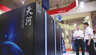 記者在現場看到,幾個兩米高的黑色機柜安置在國家超算天津中心展區的正中央,機柜上的“天河”大字分外顯眼。“‘天河’三號原型機將于6月底開始超算中心二層機房安裝部署。”國家超算天津中心工作人員告訴記者:“目前,已經開始進行布線等基礎施工。”