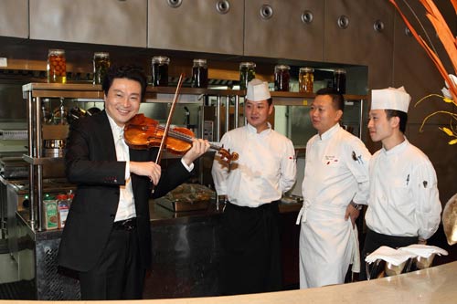 當天,呂思清與大劇院西餐廳廚師長Peter共同烹飪了“馬可?波羅套餐”中的碳烤雞胸混合生菜堅果沙拉。這款沙拉的設計靈感正是來自于國家大劇院原創舞劇《馬可?波羅》,融入了濃郁的意大利風格。小提琴大師呂思清不但親自動手烹制,還向大劇院西餐廳工作人員暢言了對這道菜品的改進意見。呂思清說:“美食與音樂,是我終其一生都不會放棄的兩樣東西,現在,它們在這里,有了某種共鳴,美妙不可方物。”