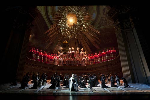 新古典主義的舞臺(tái)設(shè)計(jì)讓新版《托斯卡》從一開始就美得“超凡脫俗”,美得典雅、磅礴、精致又大氣,同時(shí)不乏現(xiàn)代與時(shí)尚。特別值得一提的,巨大雄偉的建筑結(jié)構(gòu)呈傾斜呈現(xiàn),好似鏡頭過濾后扭曲的畫面。每一幕中,也隨處可見閃耀著強(qiáng)卡洛天才般智慧的處理。第一幕結(jié)尾處,教堂的穹頂徐徐打開,不斷擴(kuò)大的縫隙像是慢慢睜開的“雙眼”,教堂四壁的油畫竟然出現(xiàn)在了穹頂,電影鏡頭式的視角轉(zhuǎn)換創(chuàng)造了奇異的舞臺(tái)效果。而當(dāng)?shù)谝荒唤K場的宗教場面進(jìn)入高潮時(shí),觀眾原以為畫面將就此“定格”,未曾想一座冒著裊裊炊煙的香爐又從舞臺(tái)側(cè)面橫空而出,鐘擺似的回蕩搖擺,預(yù)示著劇中人物跌宕起伏的命運(yùn)。