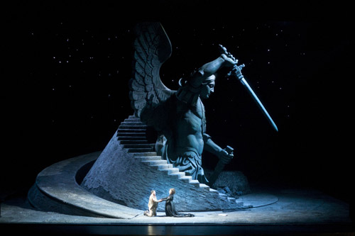 其后,舞臺(tái)進(jìn)入了全劇的高潮,第二幕和第三幕之間出現(xiàn)了一次完全沒有幕間休息的換景。傾斜的宮殿伴隨著斯卡皮亞的死亡沉入地下,同時(shí)一座手持長劍、雙翅展開的巨型天使像呈現(xiàn)在舞臺(tái)后方,如電影鏡頭般的徐徐從舞臺(tái)后方向前推進(jìn)。雖然演員還未開口演唱,為完成這一場景轉(zhuǎn)換,國家大劇院舞臺(tái)技術(shù)部門也面臨著比以往更多考驗(yàn)。巨大的天使高度近8米,利用的舞臺(tái)縱深也多達(dá)近50米。盡管每天國家大劇院每天都有一流的演出,但這種獨(dú)特的舞美結(jié)構(gòu)和無縫銜接的轉(zhuǎn)換方式還是頭一次。