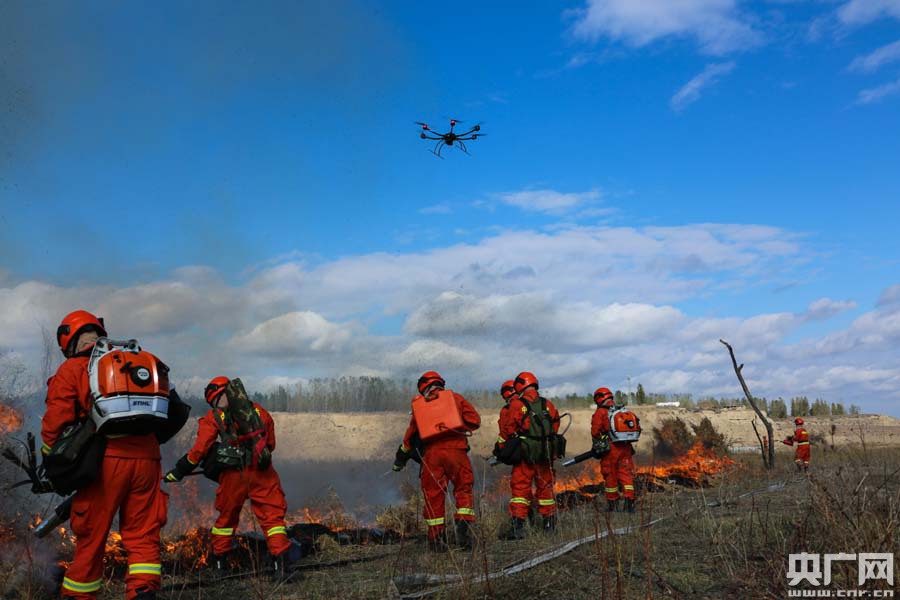 新疆伊犁森林消防支隊指戰員協同無人機滅火場景 劉海攝